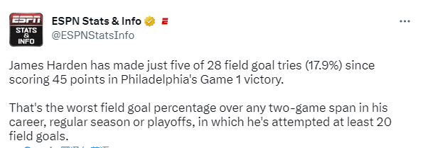 哈登创生涯耻辱纪录,据统计,最近两场比赛中,哈登投篮共计28中5,命中率仅17.9%。据统计,17.9%的命中率为哈登生涯任意连续两场比赛中(包括常规赛)的最差纪录(两场至少出手20次)。