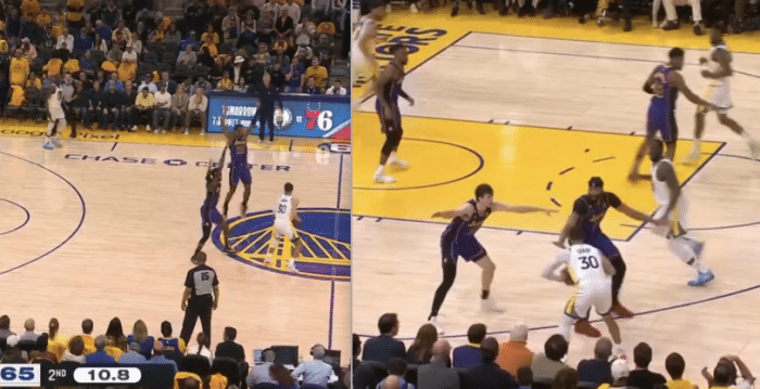 湖勇G2大战,库里一拿球就遭遇两人甚至多人包夹,三分线外被詹姆斯和范德比尔特夹击,甚至在logo处被包夹以及遭遇浓眉、里夫斯和范德比尔特的三人包夹;面对湖人的严防死守,库里打出控卫本色,用传球打乱湖人防守阵线,帮助队友轻松得分;而湖人疯狂包夹库里的最直接后果就是防守漏人,经常目送对手得分。