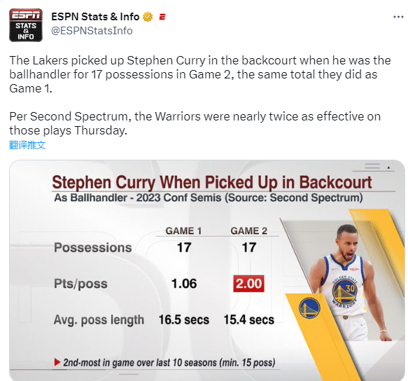 据美媒ESPN Stats&Info统计,在湖勇大战G1中,库里发动挡拆进攻17个回合,勇士每回合得到1.06分;在G2中,库里同样发动挡拆进攻17个回合,勇士每回合得到2分,相比G1近乎翻倍;这是NBA近10年个赛季在季后赛中单场第二高挡拆得分(最少15个回合)。