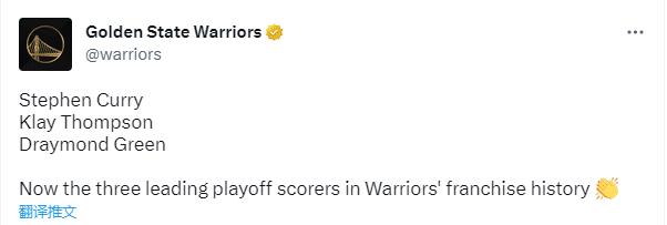 顺便提一下,目前库里(3835分)、汤普森(2990分)和格林(1786分)分别位列勇士季后赛总得分榜前三位,他们已经带领勇士夺得4座总冠军奖杯。
