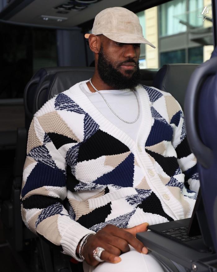 詹姆斯身穿白色长裤、戴着棒球帽,坐在球队大巴时紧盯着笔记本的屏幕,一脸专注十分严肃;浓眉则身穿橙红色上衣和黑色紧身裤,显得十分帅气;拉塞尔、里夫斯都穿得十分休闲,湖人众将乘坐大巴抵达勇士主场,然后走进球馆。