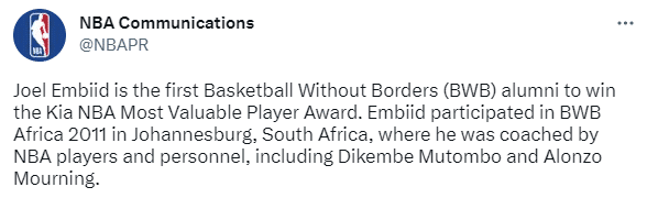 恩比德因此成为首位当选MVP的篮球无国界训练营毕业生。