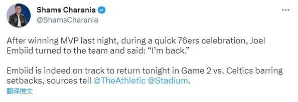 据名记shams报道,在昨天赢得MVP庆祝期间,恩比德冲着球队高呼:我回来了;恩比德有望半决赛G2复出,除非遭遇挫折。