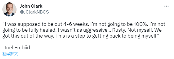 赛后恩比德对失利感到沮丧,谈到复出话题时,恩比德表示:我本应该缺席4-6周,我没有100%康复,我不会完全康复。我没有打出侵略性,生锈的,这不是我自己,我们会解决这个问题,这是我找回自我的第一步。