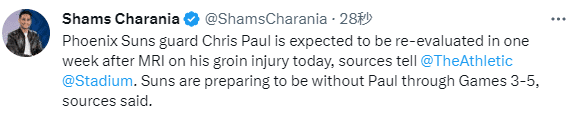 178直播05月03日讯 ,太阳球星克里斯-保罗的伤势检查结果曝光,据名记shams报道,保罗伤势确诊为腹股沟受伤,一周后接受评估,太阳预计保罗会缺席G3-G5的比赛。