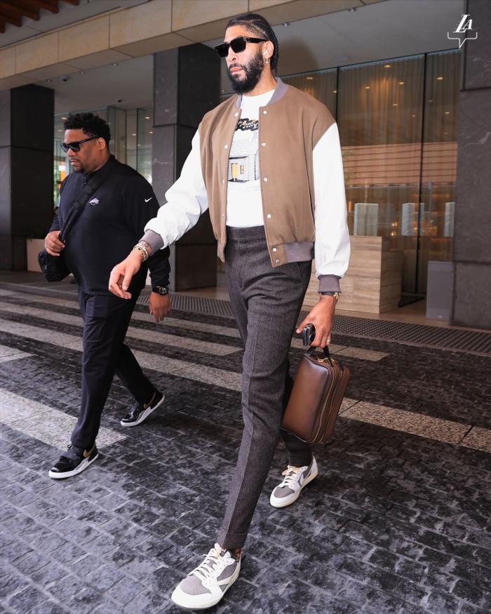 今天湖人将在客场大战卫冕冠军勇士,詹姆斯戴着黑色头巾和墨镜,身穿花色夹克和休闲裤,帅气亮相前往大通中心球馆,浓眉也是帅气出镜。