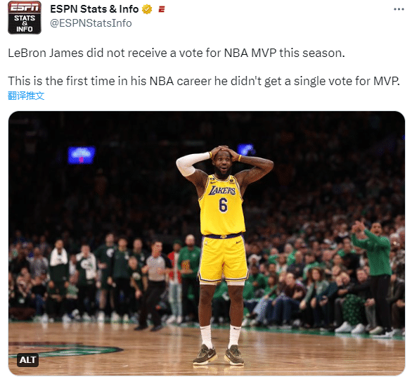 对于38岁的老詹来说,是否获得MVP选票已经不是重点,目前他正在带领湖人冲击总冠军。