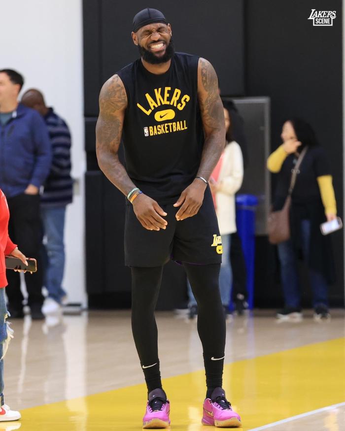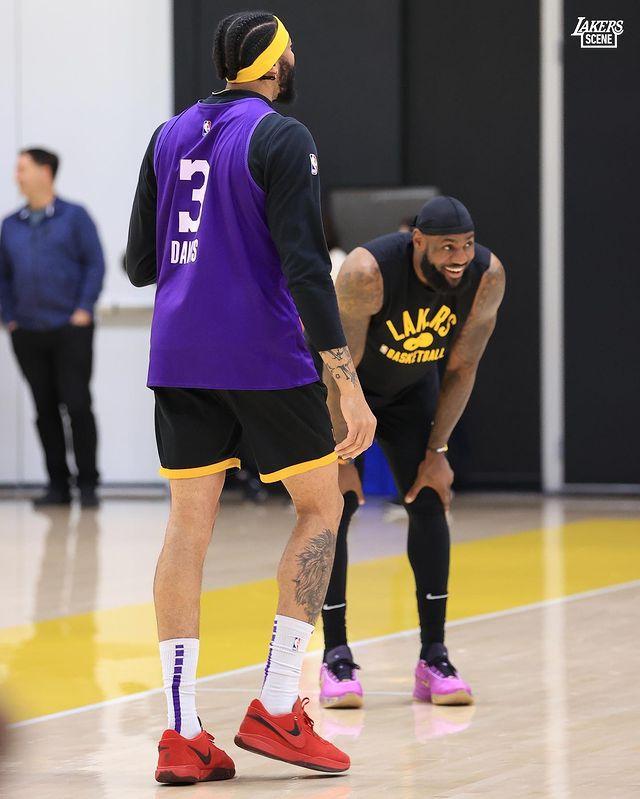飞往湾区前,湖人众将在训练馆中备战勇士,训练期间,詹姆斯在中线附近扔进一记不可思议的三分球,众人惊呼,浓眉双手抱头直接看呆了,拉塞尔指着老詹说:快看,他做到了。