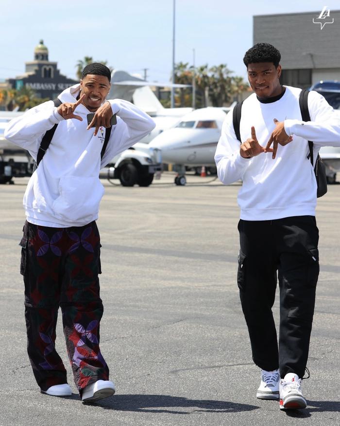 湖人全队备战后乘坐包机飞往湾区,前往客场挑战勇士,詹姆斯身穿黑色运动装,登机前扭头露出笑容,浓眉也是一身黑色运动装,戴着墨镜并且满脸笑容,湖人众将都十分轻松。