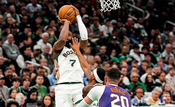 这场比赛开始的时候,还有一个小花絮,跳球时刻,TD花园灯光熄灭三秒钟。首节比赛太阳落后3分,杜兰特打满第一节的情况下,拿到15分。但到了第二节,他3次出手0分,凯尔特人的杰伦布朗第二节单节轰下15分,塔图姆半场砍下23分。凯尔特人半场领先5分。第三节结束的时候,凯尔特人三分球爆发,将优势拉大到17分。末节绿衫军顶住压力,成功拿下胜利。