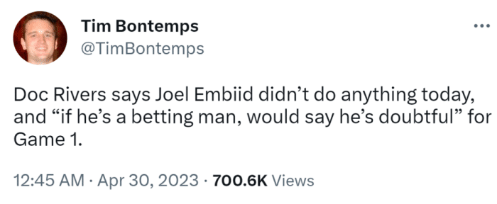 恩比德在首轮对篮网的G3受伤,但他坚持打完了那场比赛,随后他缺席了双方的第4场比赛。保罗-里德在G4顶替恩比德首发,贡献10分15篮板,帮助球队96-88击败对手。前方记者报道称,若恩比德在东部半决赛复出,他的膝盖需要佩戴护具。