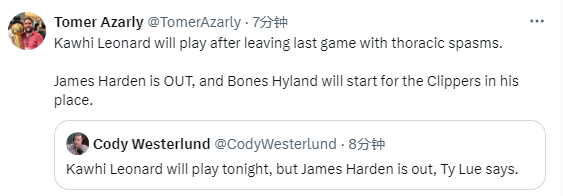 178直播03月15日讯,在快船对阵公牛赛前,泰伦-卢表示哈登因肩膀伤势缺席比赛,小卡的状态升级为可以出战;哈登快船生涯首次缺战,此前他已经连续出战59场。