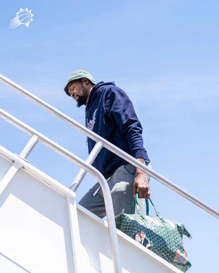 杜兰特身穿黑色连帽卫衣,提着绿色手提包,戴着一顶小绿帽;登机前,杜兰特看到开车来到机场的队友,他从车门处窥视队友;登机时,杜兰特一脸严肃的表情。