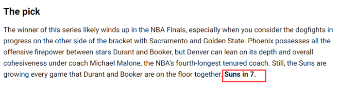 究竟谁能赢下半决赛?NBA官网预测太阳7场晋级,换言之,太阳4-3淘汰掘金从而挺进西决。