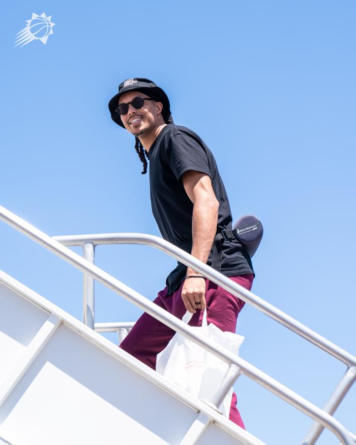 37岁的保罗身穿印有艾弗森漫画照的白色T恤,戴着墨镜以及反戴棒球帽,咧嘴大笑十分开心;艾顿、比永博、妹夫等人也都戴着墨镜登上飞机。