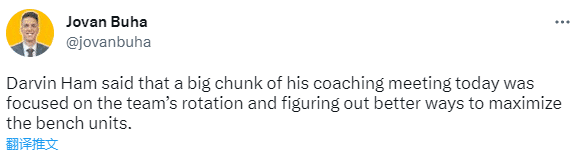 据名记Jovan Buha报道,哈姆透露今天湖人教练组开会的重点在于球队的阵容轮换上,找到最大化替补阵容的方法。