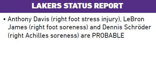 今年季后赛至今,詹姆斯、浓眉和施罗德三人一直都在伤病名单上,但他们没有缺席比赛,因此可以确定,他们都会出战G6关键一战,湖人全队都可以出战。