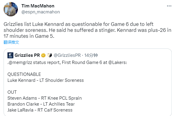 灰熊G6伤情报告也出炉,亚当斯、克拉克和拉拉维亚都因伤继续缺席比赛,肯纳德因左肩酸痛被列为出战成疑,系列赛至今,肯纳德场均拿到7.2分4篮板1.4助攻,场均命中1.6记三分,三分命中率高达50%。