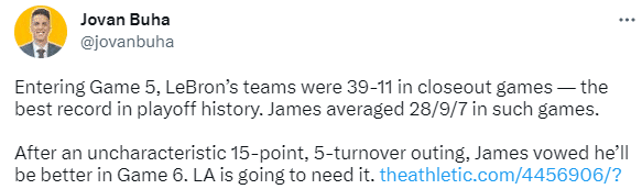 G5输球赛后詹姆斯十分自责,直言自己打得跟屎一样,相信他将在G6打得更好,因此詹姆斯有望在G6开启全力詹模式。