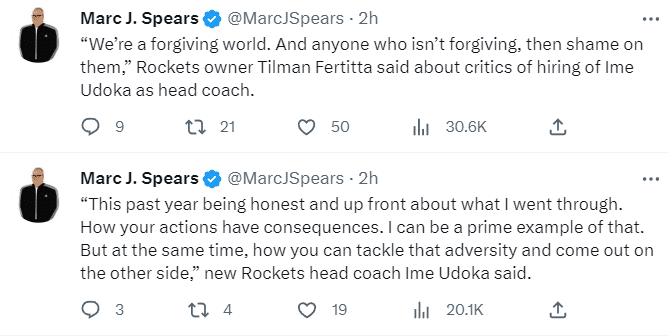 “我们认为他是一位出色的球队主帅候选人,他能把我们带到一个新的水平。他是火箭正在寻找的一切,我们对他做了很多的尽职调查,他能让我们的队员们保持强硬、体面和责任感。”