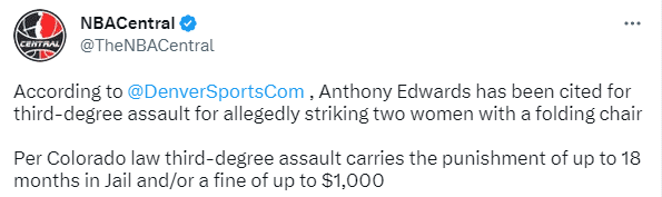 178直播讯04月27日,森林狼首轮1-4被掘金淘汰出局后,狼队新星爱德华兹惹上官司,G5出局后挥舞椅子砸伤多人,因涉嫌用折叠椅殴打两名女性被指控为三级袭击罪,根据科罗拉多州的法律,爱德华兹最高面临18个月的监禁和1000美元的罚款。