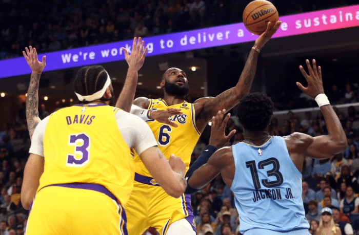 第二节詹姆斯带队7-2缩小分差,灰熊外线回应三分,詹姆斯上篮不进后浓眉补扣,湖人追到10分打停灰熊,暂停回来,詹姆斯被莫兰特从背后打成空接2+1,6分32秒老詹下场休息,浓眉扛起进攻大旗,但灰熊外线连中三分,湖人瞬间落后17分;老詹重新回来,里夫斯轰进三分,之后不看人助攻老詹反击空接挑篮,湖人8-0追分,浓眉进攻端侵略性十足,半场打完湖人52-61落后9分。