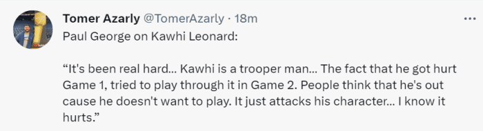 谈到莱昂纳德时,乔治说道:“对他来说很艰难,莱昂纳德是一名战士(trooper,也可以翻译成坚韧不拔的人)。事实上,他在G1就受伤了,努力带伤上场打完G2。人们总认为他不打是因为他不想打,这会伤害他的品格。他也想打球,也想多上场,也想和队友们一起。我们总归是想留给球迷、留给家人自己最好的一面,但打不了真的很难受。” 此前,名嘴Colin Cowherd曾爆料称小卡不与教练和队友交流,但未经更多记者证实。
