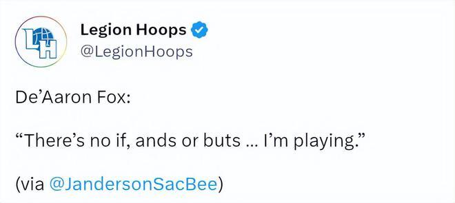 福克斯调侃:“没有如果、而且或者但是,我会打的。”他还说自己出战G5的概率是99%,甚至100%。此前,国王将福克斯的状态列为doubtful,也就是小概率出战,上场可能只有25%,但福克斯显然不想错过如此重要的比赛,他已经提前宣布,自己决定出战天王山。