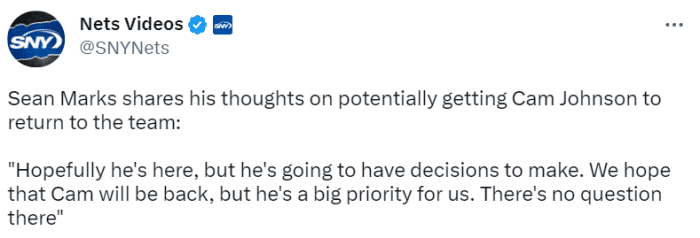 谈到约翰逊时,篮网总经理马克斯表示:“希望他能留在这里,但他需要做出决定,我们希望他能回来,他是我们的重中之重,毫无疑问。” 名记Stein报道,篮网不可能把布里奇斯、约翰逊、芬尼-史密斯、罗伊斯-奥尼尔四人全部留下,交易芬尼-史密斯和奥尼尔似乎不可避免。