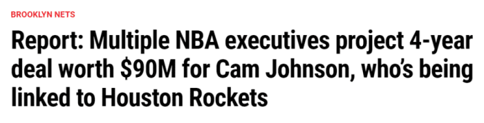 178直播讯04月25日,据HoopsHype名记Michael Scotto报道,篮网的27岁神射卡姆-约翰逊有望在今年休赛期获得一份大合同。NBA高管预计他可能得到的报价是4年9000万美元。效力太阳时,他曾拒绝球队4年7200万的续约报价。消息人士透露,预计有几支球队对约翰逊感兴趣,其中包括火箭。