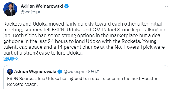 名记woj报道,火箭和乌度卡见面后很快就达成共识,乌度卡和火箭总经理斯通一直在工作上交流,双方都有很多选择性,但在过去的24小时内,火箭与乌多卡达成了交易。火箭年轻的有天赋的球员、薪金空间和14%的状元签概率是吸引乌多卡加盟的众多因素。