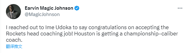 不过22-23赛季开始前,乌度卡因出轨事件被球队停职一年,之后马祖拉担任临时主帅并已升为正式主帅;如今乌度卡失业7个多月终于再就业,成为火箭新主帅,魔术师祝贺乌度卡,发推写道:我联系了乌度卡,祝贺他接受了火箭主教练的工作!休斯敦得到了一位总冠军级别的教练!