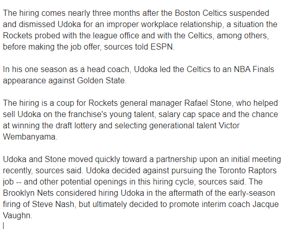之后名记woj进一步报道,凯尔特人此前因乌度卡违反队规解雇了他,在提供工作机会之前,火箭向联盟办公室、凯尔特人进行了相关调查。