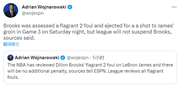 178直播讯04月24日,狄龙-布鲁克斯会因袭击詹姆斯的裆部被联盟禁赛吗?据名记woj报道,联盟官方审查了狄龙对詹姆斯的二级恶意恶犯,不会有罚款以及禁赛的追加处罚。狄龙回应此事:媒体和球迷让我成为恶棍。