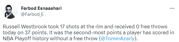 3、威少得分是NBA历史季后赛0罚球第二高分