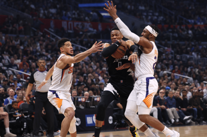 在缺席小卡和乔治两大核心的情况下,威少第一节带队30-23领先7分,不过第二节被快船反超;下半场,威少第三节开场率领快船9-0扭转局面,并且单节拿到10分,无奈太阳四巨头实力太强,三节打完快船仍旧落后;末节快船一直落后,威少单挑布克、杜兰特以及外线两记三分,连得10分苦苦支撑,关键时刻杀到禁区上篮以及大帽保罗,无奈双拳难敌四手,最终快船100-112不敌太阳,系列赛大比分1-3落后,被逼到生死边缘。