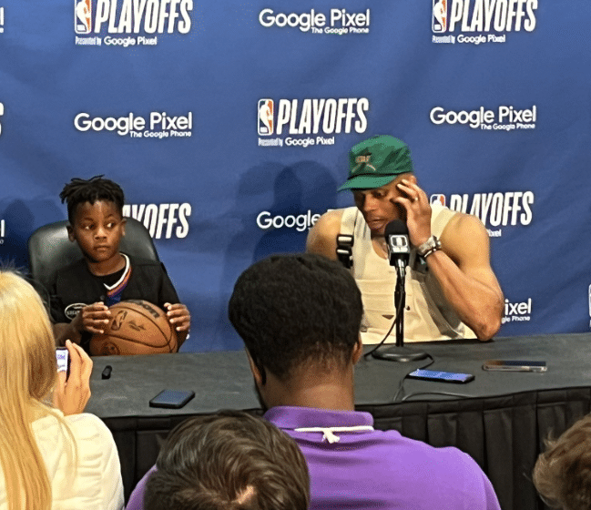 赛后谈到G5生死战,威少表示他会继续攻击篮筐,希望他们能够获得更多的罚球,值得一提的是,威少带着孩子参加新闻发布会。