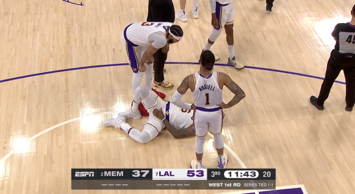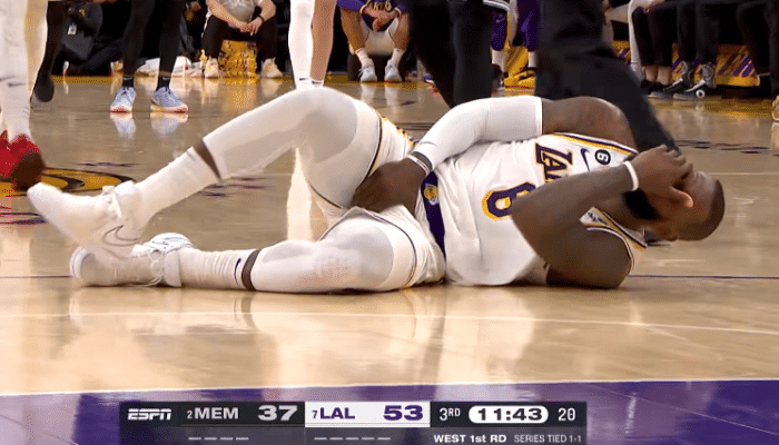 178直播讯04月23日,NBA季后赛湖人G3主场对阵灰熊,下半场第三节,詹姆斯惨遭狄龙袭裆,痛苦倒地,裁判回放之后,升级判罚狄龙吃到二级恶犯被驱逐离场。