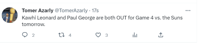 名记Alec Strum转发莱昂纳德缺席G4的报道,并感慨道:“这轮系列赛已经结束了。”知名数据网站FiveThirtyEight显示,快船的晋级概率只剩下13%,预计后续还会继续下跌。