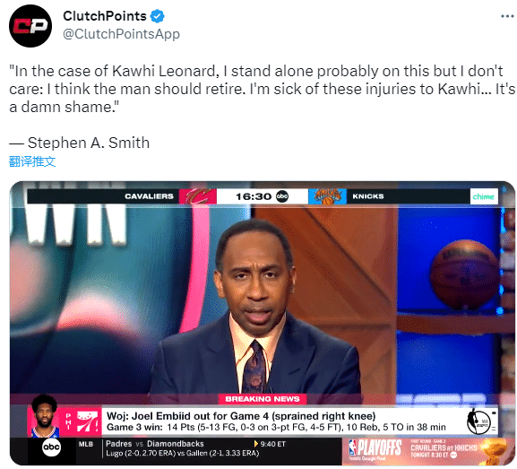 对于小卡因伤缺战G4,名记woj在节目中表示:莱昂纳德因右膝扭伤将再次缺席G4,此前他已经因此缺席了G3;这对于快船而言是非常困难的情况,他们已经在缺少保罗-乔治的情况下出战,看起来,本赛季剩余的比赛他们也许不会再拥有莱昂纳德了。