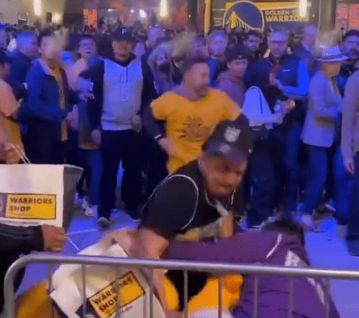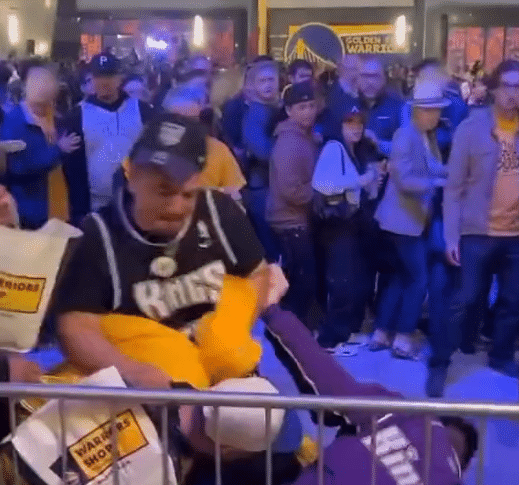 据报道,在勇士和国王系列赛G3赛后,两名勇士球迷和三名国王球迷发生火爆全武行冲突,两队球迷扭打在一起,之后勇士球迷被打趴下,国王球迷明显占上风,身穿国王55号球衣的国王球迷暴揍勇士球迷,连续挥拳击打勇士球迷的脑袋,即使安保人员过来制止,该球迷仍击打勇蜜的头部。
