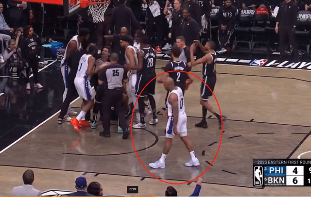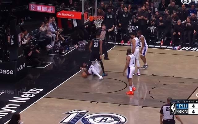 首节进行到还剩9分34秒时,克拉克斯顿在一次上篮后将恩比德撞倒在地。随后,克拉克斯顿看着倒在地上的恩比德,直接伸脚想从他身上跨过去。大帝恩比德怎么可能忍受这样的恶气,他在克拉克斯顿跨过一只脚之后,直接抬腿踢翻了克拉克斯顿。