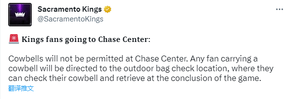 根据赛程,勇士和国王G3将于4月21日上午10点在大通中心开打,据国王官方通报,大通中心禁止使用牛玲,任何携带牛玲前往大通中心的国王球迷,他们的牛玲都将被寄存起来,比赛结束后取回。