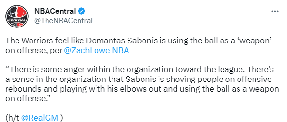 名记扎克-洛维透露,昨晚当禁赛决定被宣布后,勇士方面感到震惊、猝不及防。勇士内部对联盟的决定感到有些愤怒,勇士内部有一部分声音认为,萨博尼斯在抢进攻篮板时推人、在比赛中挥舞胳膊、将球作为进攻的武器。当然,最终有人采取了报复行为。你想怎么说都行。