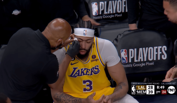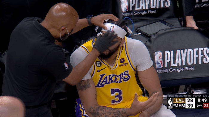 第二节8分49秒,浓眉和贝恩在中场跳球时,浓眉的眼睛被贝恩的手肘击中,眼角被打开,痛苦倒地,眼角流血,随后浓眉坐回替补席,湖人队医为他止血治疗,之后重新上场;浓眉又在防守端大帽对手,詹姆斯反击上篮,可湖人刚想起势,贝恩连得4分,浓眉惨遭大帽,灰熊8-0又拉开分差,无莫熊瞬间领先到15分。