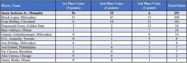 不过小贾伦杰克逊在DPOY的竞争中取胜,过程非常惊险。他拿到了56张第一选票总计391分,而第二名的大洛佩兹拿到了37张第一选票总计309分。在此前外界的预测中,35岁的大洛佩兹都处于领先位置。不过最终,小贾伦·杰克逊“爆冷”夺得年度最佳防守球员。