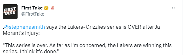 莫兰特遭遇伤病,名嘴A-史密斯直言这个系列赛已经结束了,湖人正在赢下这个系列赛,我认为这已经结束了。