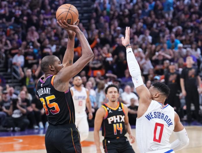 178直播04月18日,快船和太阳系列赛G1,威少防守太阳三巨头的数据出炉,据统计,威少防守杜兰特、布克和保罗59个回合,仅仅让他们拿到6分,BCD投篮命中率仅仅只有25%。