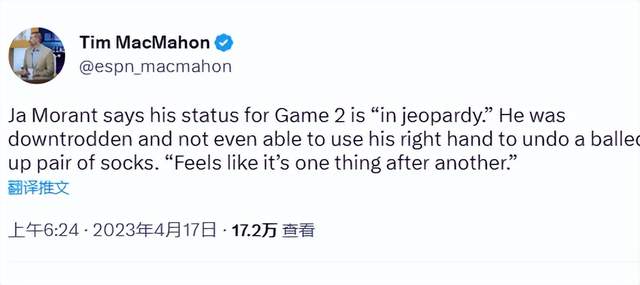来自名记麦克马洪的报道,莫兰特本人表示,自己出战第二场的可能性“处于危险之中”,他现在甚至不能解开一双卷起的袜子。同时根据报道,莫兰特在更衣室显得垂头丧气。