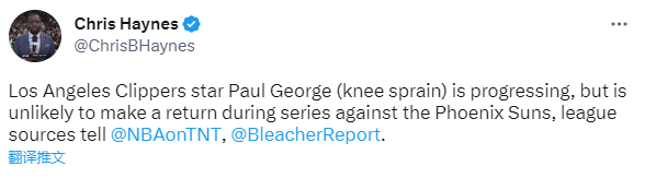 178直播04月17日,据名记Chris Haynes和Woj报道,快船球星乔治的膝盖伤势回复取得进展,但他不太可能在与太阳的系列赛中复出;换言之,乔治很可能因伤首轮报销,大概率无缘复出战太阳。